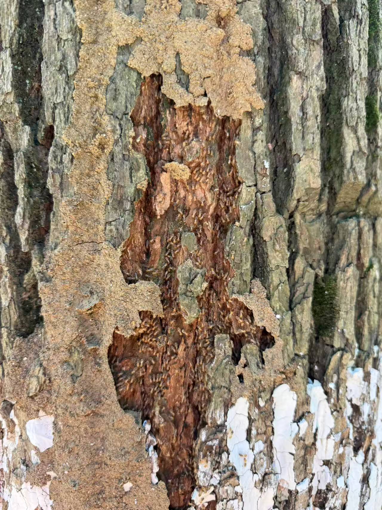 如果看到如图的香樟树或者其他树木上有泥土状物,可能是白蚁光临到这个地方,一定要注意,找专业的机构上门检查处理。